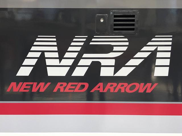 【車体側面に書かれたNRE(ニューレッドアロー)のロゴ】