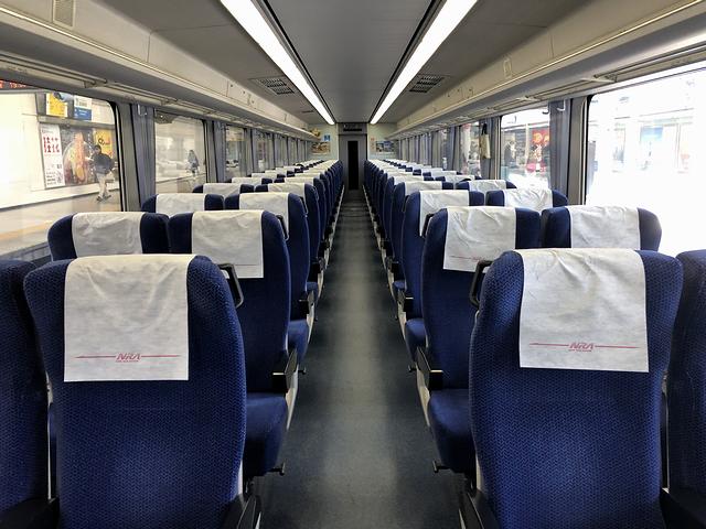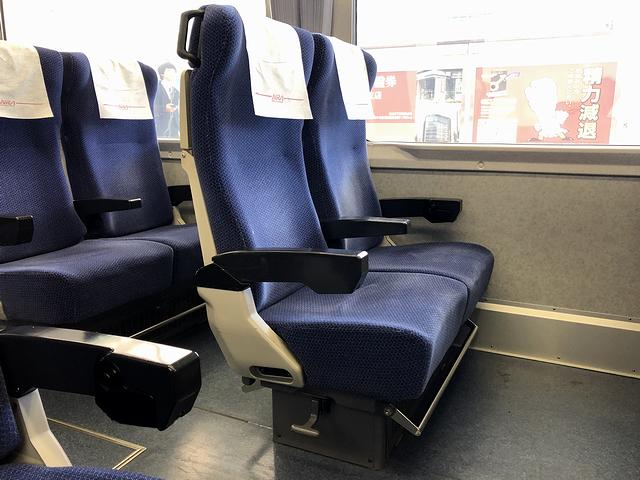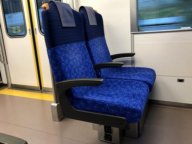特急券を受け取りSuicaで改札口を通り、既に2番線ホームに入線していたニューレッドアローこと10000系電車とご対面。まじまじと見るのは初めてなのですが、丸みを帯びた先頭部は先代の5000系電車のイメージも残り、モノトーンに深紅の帯というカラーリングもスタイリッシュに見えます。それで列車の写真を撮ってから指定された7両編成の後ろから2両目となる2号車に乗り込むと、発車2分前のアナウンス。厚みのあるバケットシートタイプの回転式クロスシートが並ぶ車内は、ちょっと前の特急型車両っぽい重厚な雰囲気。また、シートの下に足を入れられないタイプというのもちょっと昔っぽいのですが、シートピッチは1070mmと広い(参考までに、東海道新幹線普通車が1040mm、JR東日本普通列車グリーン車が970mm)ので、窮屈さは有りません。