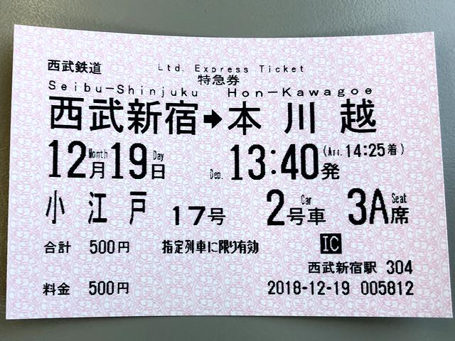 【受け取った特急小江戸17号の特急券】