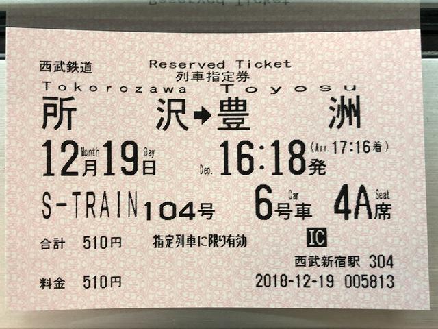 そばをいただいた後、少々時間が空くのですが、次に乗るのは所沢駅始発となる、16時18分発のS-TRAIN104号豊洲行き。