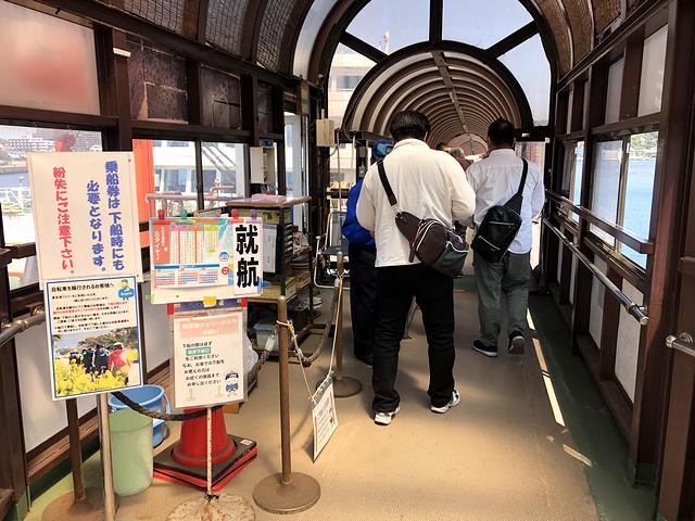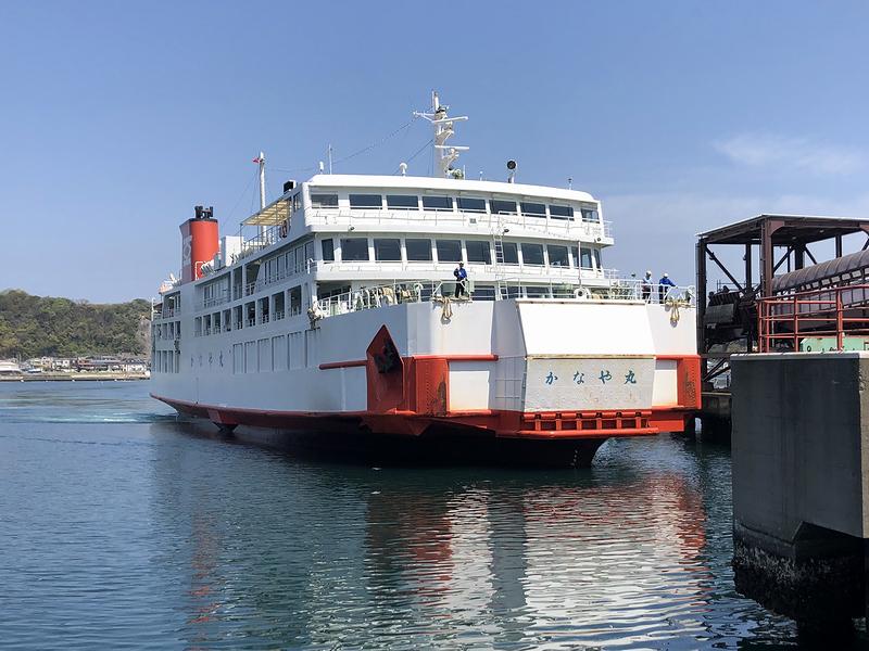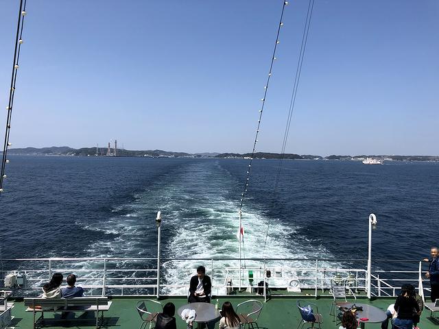 それでも、乗る便の出航時刻である11時25分まで時間があったというか、食べ終わって外に出ると、折返しとなるフェリー「かなや丸」が丁度入港してきたところでした。ちなみにこの東京湾フェリーですが、この「かなや丸」ともう一隻の「しらはま丸」が交互に運行されています。で、接岸までその入港の様子をを眺めてから再びフェリーターミナルへ。2階の乗船口には既に待機列ができており、11時08分に乗船開始となりましたが、とりあえず、正面が見える席を確保。出航を待っていたところ、出航時刻のわりと近くまで乗船させるんですね。で、定刻の11時25分、モーターの音が響き出し、11時27分に離岸。バックで出航し、港内で方向転換。逆にL字を書く様にして久里浜港を離れました。