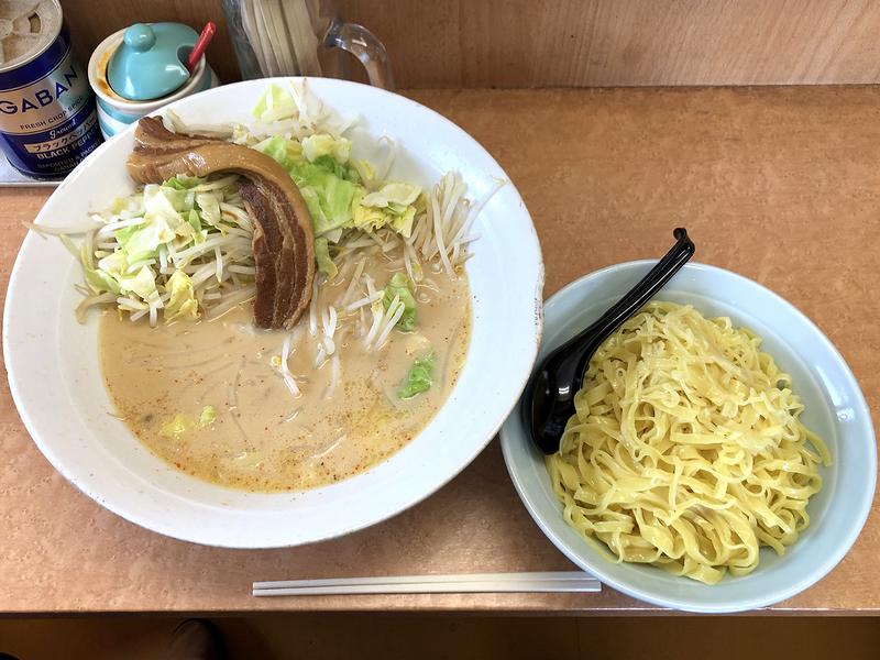 それで今回はかなり暑い日だったということもあり、つけ麺をいただくことに。もちろん、トップにクルマを入れたので、なんの心配もなく「肉」を載せられます。で、相変わらずの巨大な容器に圧倒されつついただくのですが、動物系のベースにスパイシーな味噌ダレとまろやかなミルクが加わったつけ汁に、ピロピロっとした幅広の麺を浸けズルズルっと啜り込めば、これが、もう。ぶっちゃけ、ラーメンのスープと味はほぼ同じだと思うのですが、水で締めた冷たい麺を浸けるだけで、また違った味わいに感じられます。そして具ですが、まずはホロトロっと煮込まれた「肉」が何とも。容器が巨大すぎて相対的に小さく見えてしまうのですが、実際はかなりの大きさがあり、つけ汁の容器に入った暴力的な量の茹で野菜と共にワシワシと。また途中から、卓上のラー油にニンニクとショウガが入った調味料を多めに投入。これで味にパンチが出、お陰で完食まで頑張ることが出来ます。