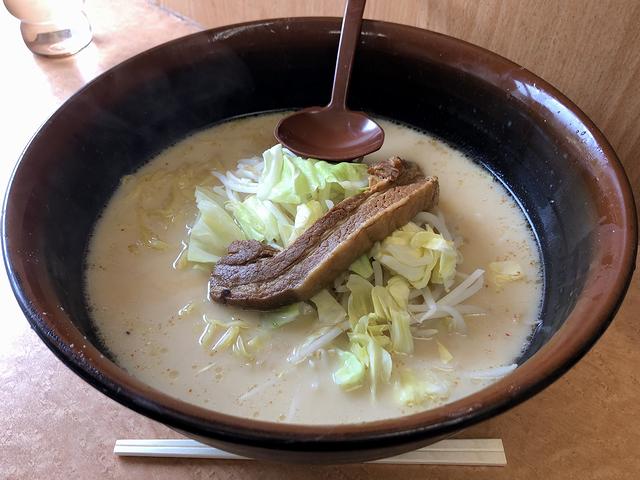 こちらは、同行者がいただいた品。「野菜少なめ」で注文したことによって、丼の大きさ(そして、デフォルトの野菜の量)がわかるのではないでしょうか。で、一生懸命麺を啜り、肉をかじり、スープは残しましたが固形物は完食していました。