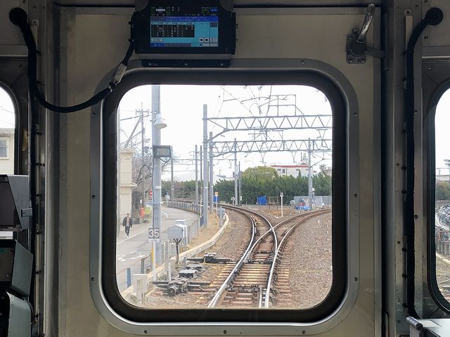 若林駅で2度めの列車交換を終えた列車は、ここから暫くの間、前方に向かって線路の右側は宅地、線路の左側は農地という景色の中を走行。その際、線路は何本かの細い用水路を短い橋梁で跨ぐのですが、橋梁の前後には、白く塗られた古タイヤが埋め込まれています。これは名鉄独特の風習ですかね。それと共に珍しく感じたのは、1月の下旬にもかかわらず、田んぼに水が入っているところがあり、更にはトラクターもその中に。このあたりは代掻きがとても早いんでしょうかね。もっとも、この日は個人的に代掻きが行われる季節のように暖かく、昨日は気温的に丁度良かった冬用のコートを着ていると茹だってしまうようでしたが。