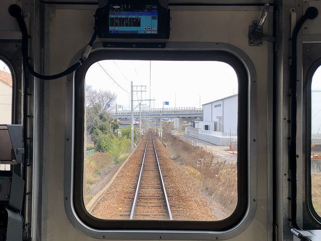 三河八橋駅を発車した列車は、高架線の構造物は複線用だけど線路は単線という区間を走行しつつその途中、伊勢湾岸自動車道が更にその上を跨いでいきました。それにしても、知立駅を出て以来、大きな道路と交差してばっかりですね。で、地上に降り程なくすると、乗務員室から女性の声で自動で流れるぽい正午の時報が。そういえば、朝イチで乗ったパノラマカー以来、この乗務員室から毎正時に聞こえてくる時報を何回も聞いた気がする=とても時間が経ったように感じるのですが、まだ正午なんですよね。