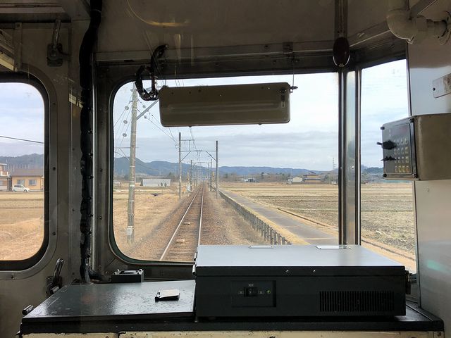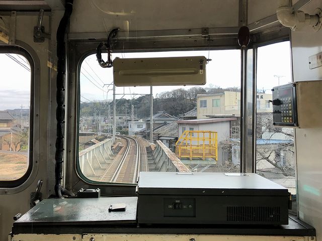 犬山駅を出た列車は、左にカーブして広見線へと。右手には、名鉄で2番目に大きい車両基地、犬山検査場が。そして次の富岡前駅までは住宅地が眼に入るのですが、それを過ぎると車窓は鄙びてきて、田んぼの中に住宅、そして河岸段丘か里山かわかりませんが小高い地形という風景が続きます。