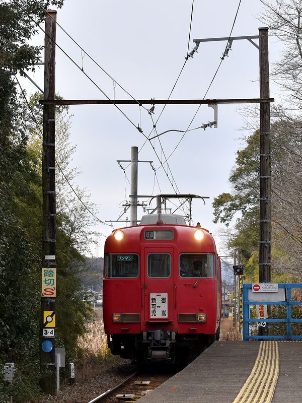 新可児駅を出て約4分で、平成13年(2001年)までは八百津線が分岐していたこの区間唯一の交換可能駅である明智駅に到着。もっとも、この時間帯の広見線末端区間は列車交換はなく、同じ編成が行ったり来たりしているだけなのですが。それにしても、線路脇に植えられた南天が赤く色付きとても綺麗ですね。