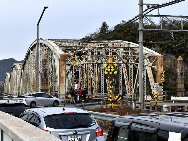 この犬山橋。架橋は大正14年(1925年)と大変歴史があり、架橋した翌年に鉄道の運行が開始して以来、平成12年(2000年)にこの橋の下流側に、車道と歩道用の橋が作られるまでの75年もの間、鉄道道路併用橋として使われていました。それで架橋当初はともかくとして後年は地元や名鉄にとって通行上のボトルネックとなってしまっていたとは思うのですが、鉄道趣味的には大変面白い存在だったんですよね。