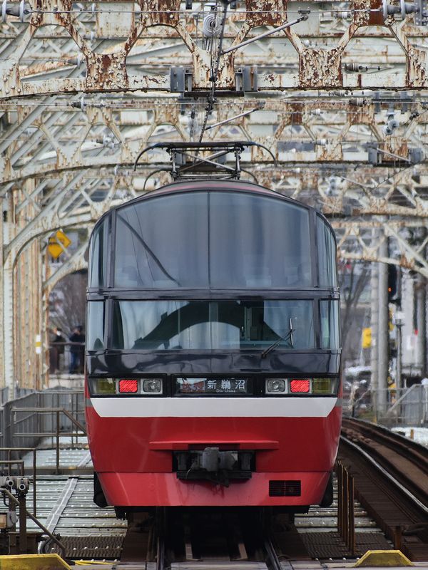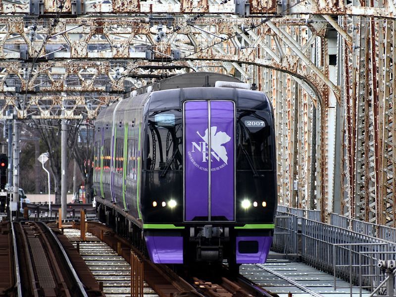 実はこの1月から名鉄は、6月に公開予定だったアニメ映画『シン・エヴァンゲリオン劇場版』とタイアップをしていて、特急ミュースカイに使われる2000系電車に、そのエヴァンゲリオンの特別塗装をしていたんですよね。この日のこの時間、それが犬山橋を通過するなんて知りもしなかったのですが、いくつかの偶然が重なって、カメラに収めることが出来ました。(まぁ、出来の方はアレですが。)