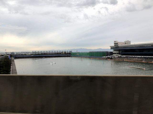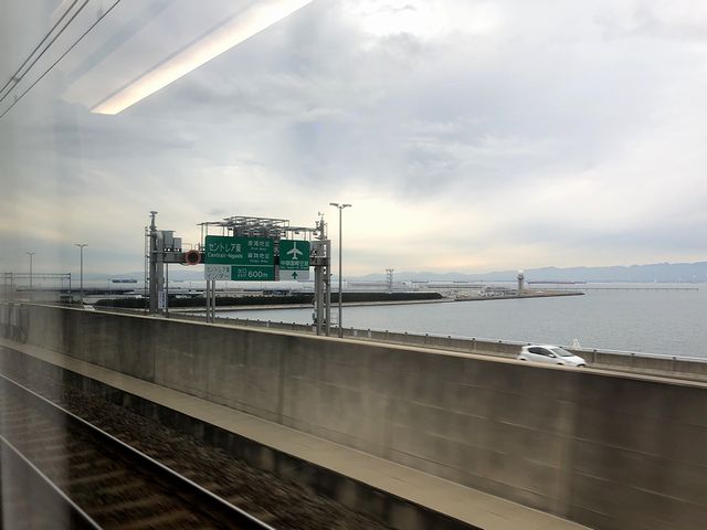 また高架線へと登り常滑駅を通過して空港線へと入ると、右手に競艇場(ボートレースとこなめ)が。この列車に乗った時に感じたときめきは早々に落ち着き、列車が進むにつれ徐々に大きくなっていったさみしさを感じながらも、そんなことはお構いなしにミュースカイは、相変わらずのスピードで景色を後ろに飛ばしつつ疾走。りんくう常滑駅を通過すると、中部国際空港がある人工島への長い海上橋へと入りました。