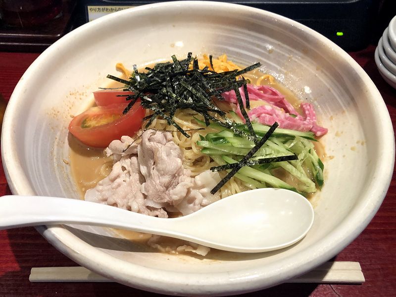 それでまずはタレですが、ややトロみが付いたものにゴマの粒がちらほら入っていて、味付けは甘味と酸味がしっかりと立ったタイプ。量が多めに入っているのが嬉しいですね。また麺は、このお店で言うところの「中華細麺」。キンっと相当冷たくに締めてあって、歯応えマシマシという感じ。ほんと、弾力がすごいです。それと具は、冷シャブ的豚肉が目立ちますが、他にも錦糸卵、サラミハム、キュウリ、トマト、刻み海苔とひととおり。お約束のカラシは付いていませんが、無料コーナーには紅生姜や辛子高菜と辛モヤシ、加えて卓上に一味やラー油があるので味変にはそれらを使用したところ、辛モヤシと紅生姜、ラー油はとても相性が良かったです。