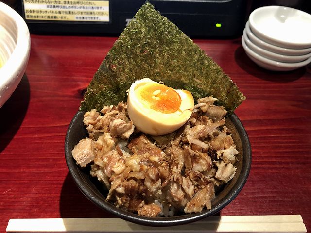 こちらは、一緒にいただいた平日ランチ限定の品。いただこうとしてまず気が付くのは、チャーシューと煮玉子がちゃんと温かいんですよね。冷たいほうが美味しいものは冷やし、温かい方が美味しいものは温めるという、当たりっちゃ当たりのことですが、ラーメン店のサイドメニューでは、これを徹底してやっているところは少ないんじゃないでしょうか。それと味付けに、取って付けたようなタレ感がないのも好印象です。あとこちらも、紅生姜や辛子高菜、辛モヤシで味変すれば、どれも合いました。