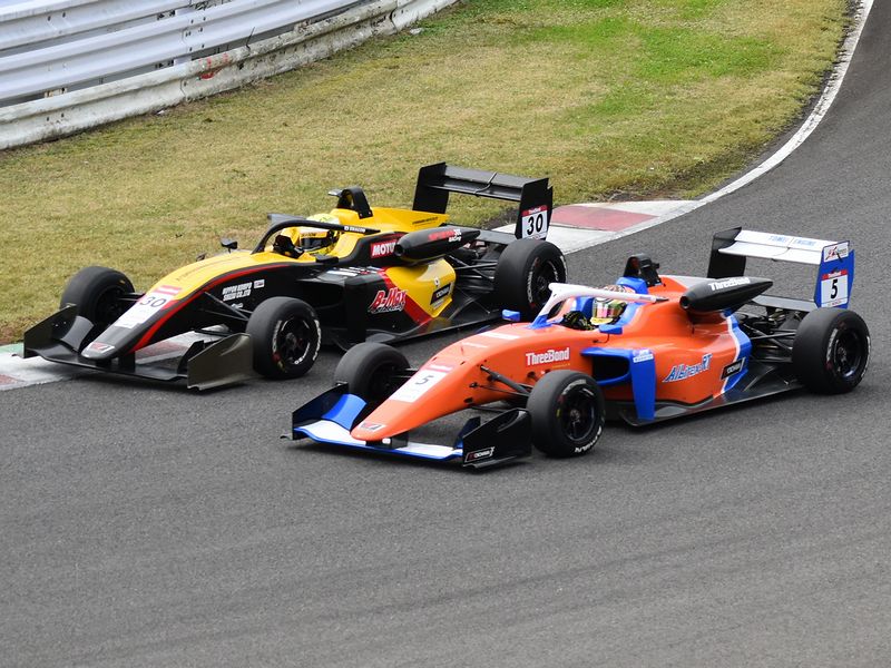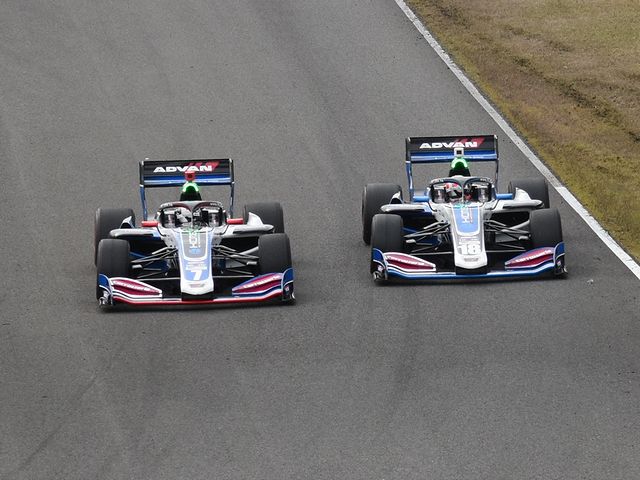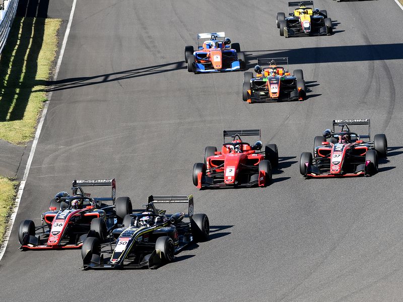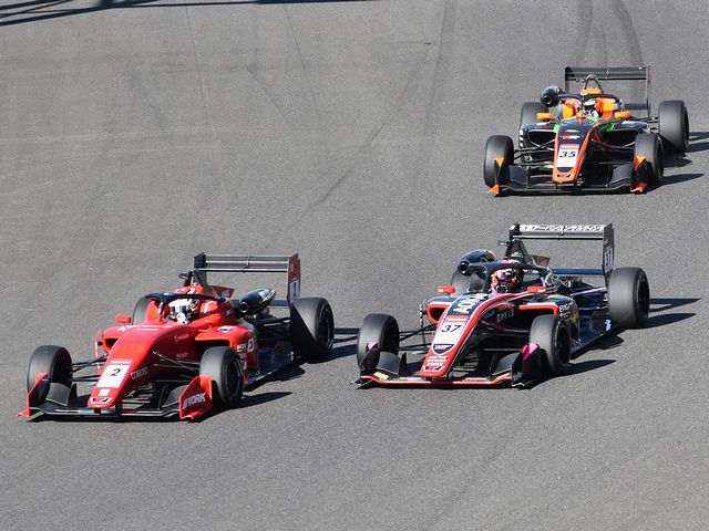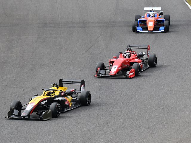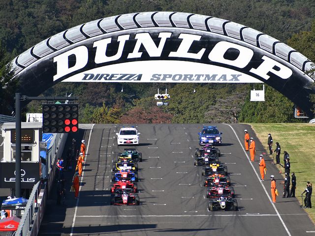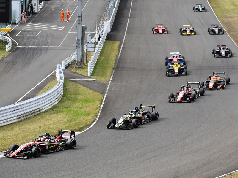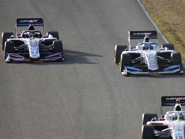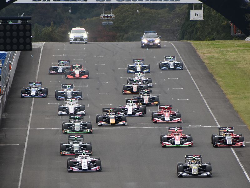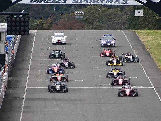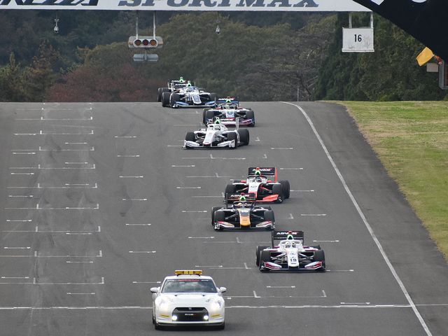 そして1周のフォーメーションラップ終了後、昨日とはうって変わった見事な秋晴れの中、第7戦の決勝レースがスタート!アウト側のポールポジションからNo.50の阪口晴南選手(B-MAX RACING TEAM)が気合の入ったスタート奪取を決めてホールショットを奪い、予選2番手のNo.36の宮田莉朋選手(CALLORA CHUKYO Kuo TEAM TOM'S)は一瞬並びかけたものの2番手で1コーナーへ。ですがその後ろでは、4番手スタートだったNo.2の名取鉄平選手(TODA RACING)が1コーナー進入でNo.37の小高一斗選手(CALLORA CHUKYO Kuo TEAM TOM'S)を交わして3番手に浮上しました。