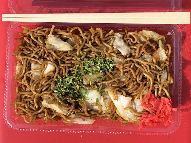 焼きそばは、ブルドッグソースの幟旗が立っていましたが、もうちょっと味が濃い方が好み。あと細めの麺がかなり短めすが、紅ショウガが嬉しいです。