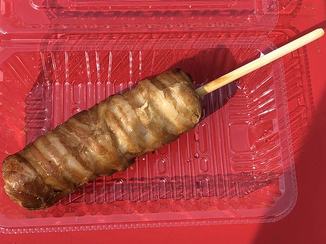 それと肉巻きドッグは、初めて食べたのですが、肉巻きおにぎりを棒に刺したような食べ物でした。