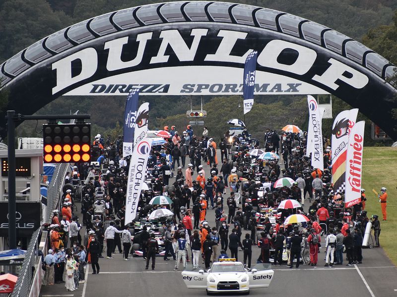 関口選手のクルマの回収のため、その後は11分遅れでスケジュールが進行。コースアウトした関口選手も、無事元のグリッドにつくことが出来ました。また、予選でクラッシュした大湯選手もマシンの修復が成り、最後尾のグリッドについています。