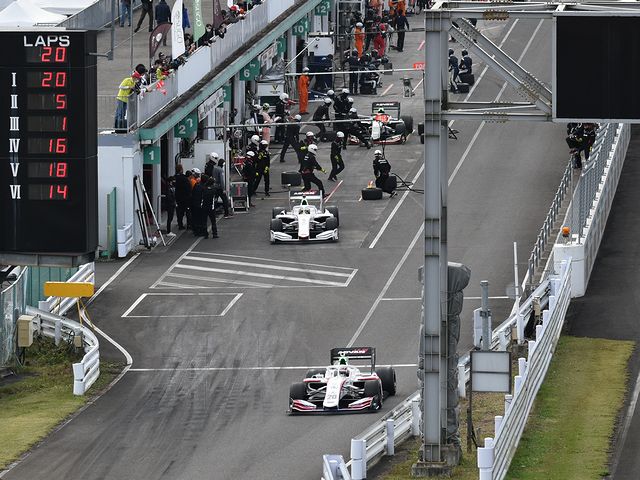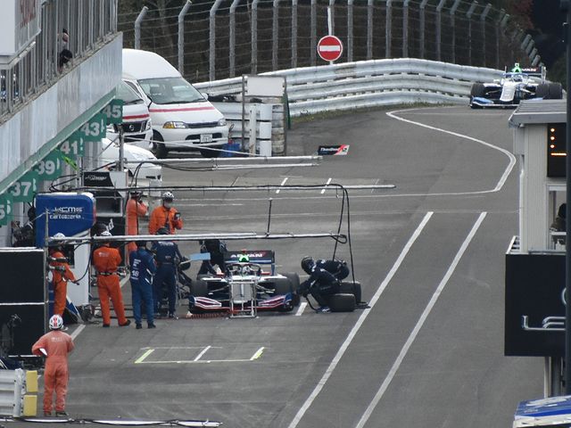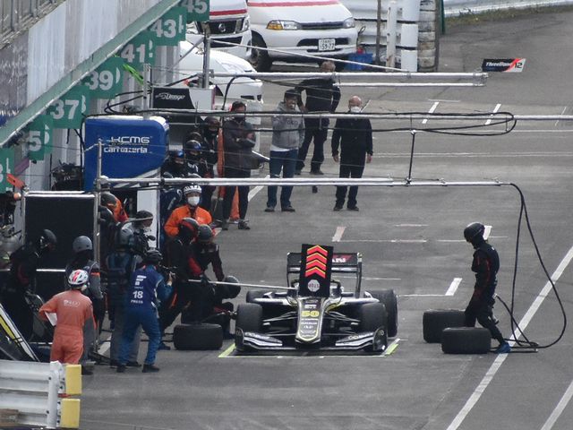 その直後でしょうか、その小林選手が10周目を終えピットインが可能になると、真っ先に飛び込んでタイヤ交換。すると主に後方グリッドからスタートした選手たちがこれに呼応。数周の間にピットに入って下位の順位変動がめまぐるしいことに。そんな中、塚越選手のチーム、ThreeBond Drago CORSEが素早いピットワークで再びコースに送り出し、この時点でのタイヤ交換組の中ではトップに立ちました!