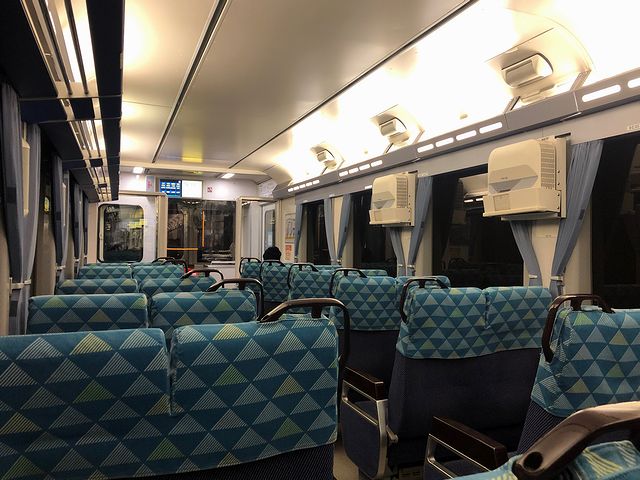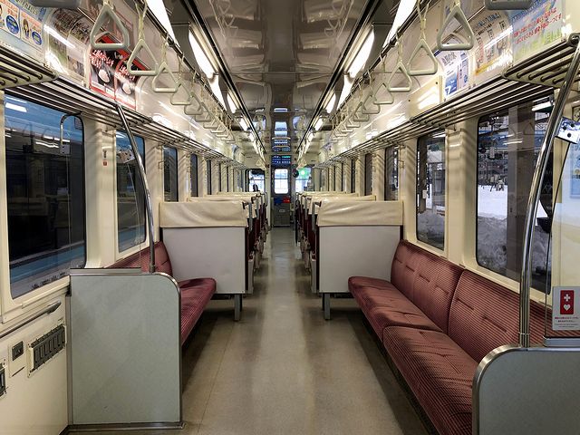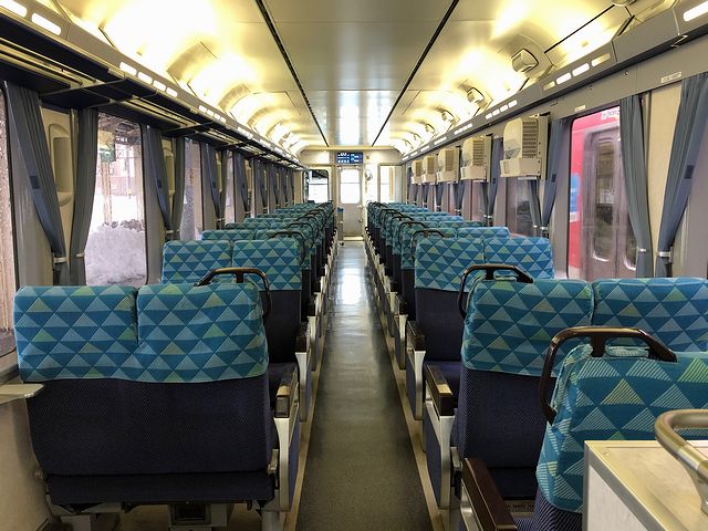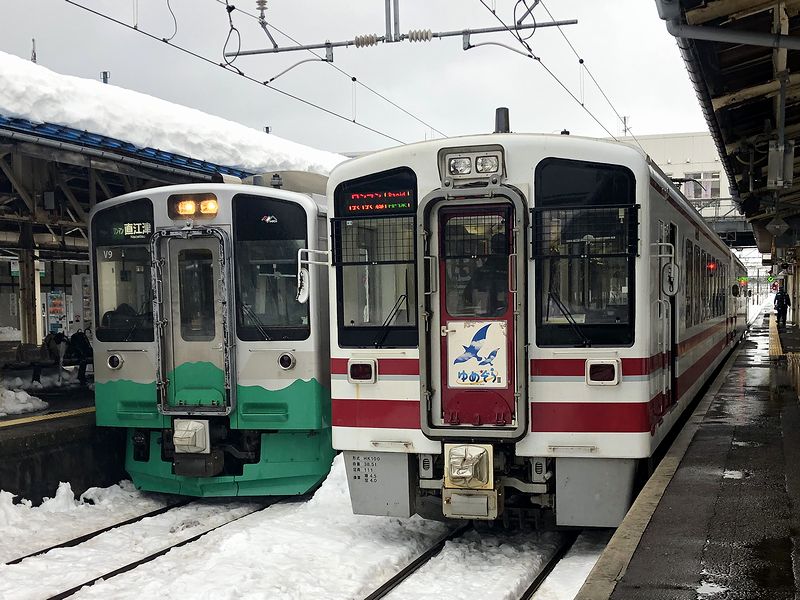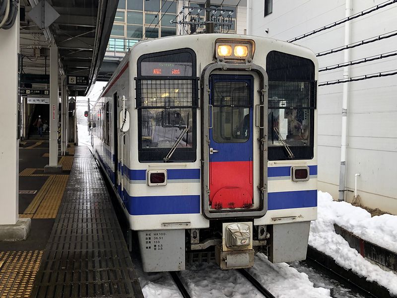 もう車内には入れるようだったので、再び転換クロスシートのHK100-9 ゆめぞらIIに乗車。発車間際に、えちごトキめき鉄道からの乗り継ぎ客を数名受けたあと、運転士さん「発車します」という声と共に発車。2両編成のうち、後部となるこの車両には4人ほどの乗客が。