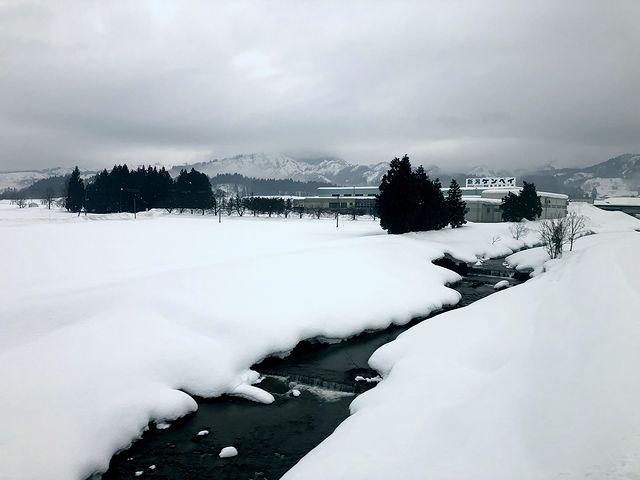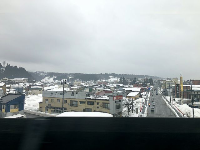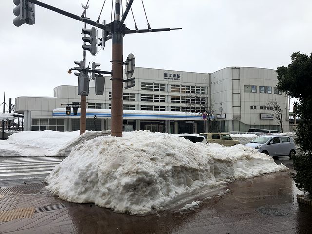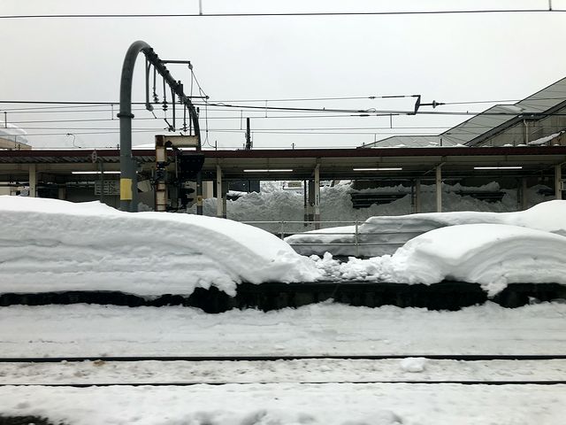 程なくして、黄緑色をした架線柱が目に入りましたが、それを見て「新潟に来たなぁ」と実感。また雨こそ降り続いているものの、景色は一面の雪景色で、途中の塩沢駅のホームでは融雪装置から水が出ていた景色というのも、「雪国に来たなぁ」と。
