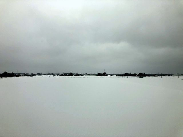 くびき駅を出た列車は、一面の水田の中を走行。どこまでも続くかのような雪原になっていて、それはそれで見事なのですが、水田に稲のある時期は、さぞや美しい光景が広がっているんでしょうね。