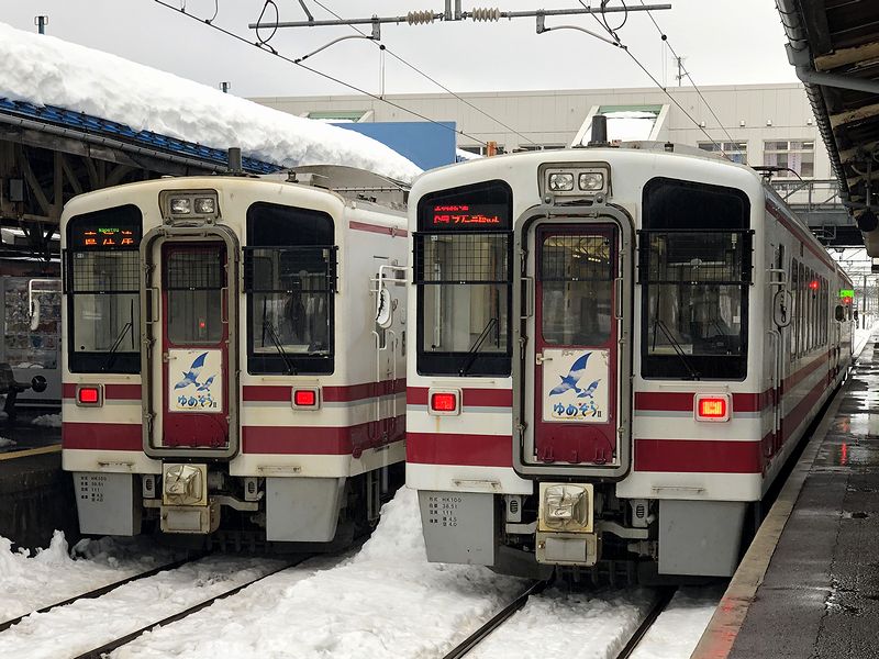 そんな一杯を食べ終わって外に出ると、私が乗る列車の1本前となる、13時16分発の六日町駅行き普通列車が発車していくところ。それを駅の外から見送り、再び改札口から入ってホームに出ると、私が乗る13時53分発の越後湯沢行き超快速スノーラビット号が既に停車中というか、先程乗ってきた2両編成の折返しでした。