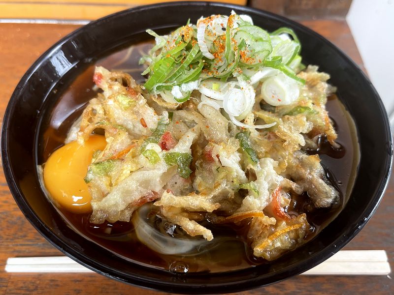 お姉さんの神速の調理で完成した定番のアレこと天玉ソバ。近くの椅子が空いていたので、そこに座っていただきます。