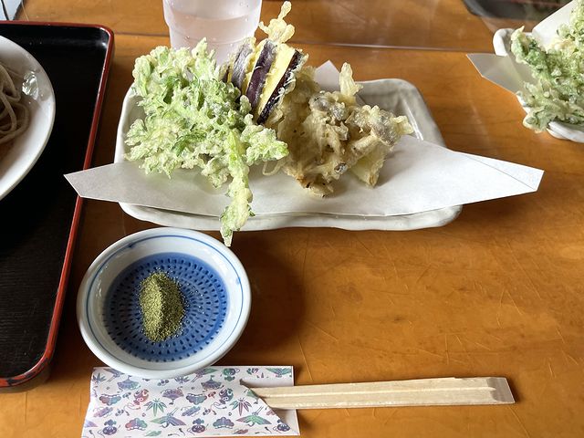 タネは、ナスやネギ、春菊、ブナシメジといった野菜たちですが、素材ごとにタネの火の通し加減が丁度良く、おかげでジューシー。一方衣はサックリクリスピーな軽めの食感で、ほんと良い揚げ方ですね。