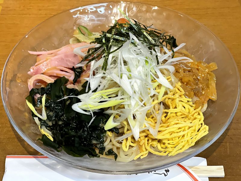 それと具は、細切りのハムとキュウリ、スライスしたトマト、錦糸卵(市販品?)、刻み海苔といった定番の他、乾燥ワカメは浸透力の低いごまだれということもあり、ちょっとモシャっとした食感。個人的には、中華クラゲが載っているところが嬉しいですね。あと笹切りの白ネギが、ごまだれによく合っていました。