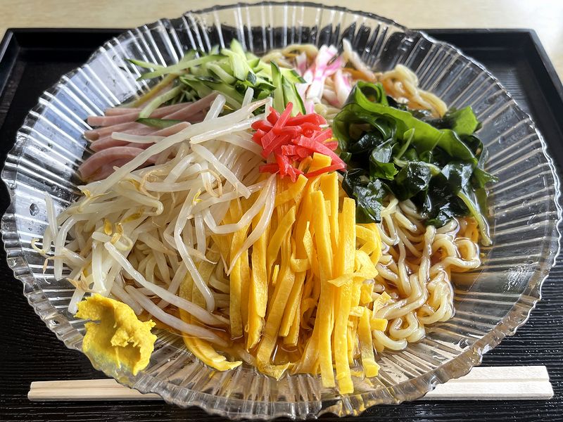 お店の前の国道4号は、それこそ数え切れないくらい通ったことがあるものの、お店の方にはこれまでお伺いできていませんでした。で、そんなお店に冷やし中華を口実に初訪問するのもまた一興ということで、駐車場にバイクを停車。お店に入ると、奥に食券の券売機が置いてあるのがわかり、冷やし中華があるかどうかドキドキしながら券売機のところへ向かったところ、近くの壁に「冷やし中華」と書かれた写真付き張り紙を発見!速攻で食券を購入し、店員のお姉さんに手渡しつつ着席。程なくして、冷やし中華が登場しました。