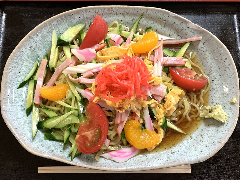注文したあと、こちらのお店の盛りの凄さを思い出して「しまった」と思ったのですが、登場した冷やし中華は大きな横長のお皿に盛られ、みるからにボリューミー。それと、盛り付けもステレオタイプな冷やし中華のように具材ごとにまとめて載せるのではなく、麺上にキュウリ、ナルト、ハムが散らされ、中央部に錦糸卵と紅ショウガが載り、放射状にミカンとトマトがあしらわれて、更にはカラシではなくワサビが添えられているというのがかなり特徴的ですね。