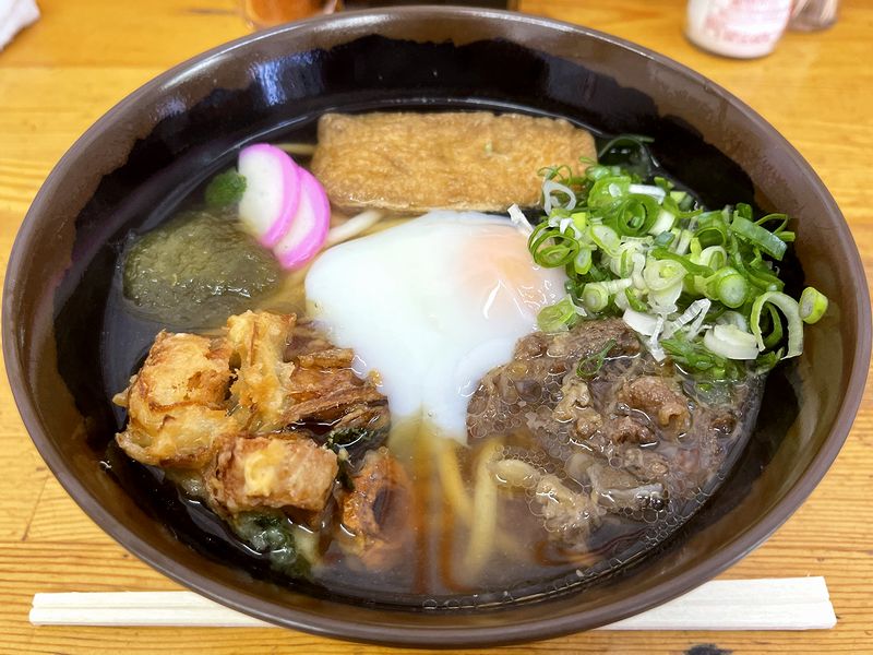 そして具は、店名を冠する=フラッグシップということで、かき揚げ、温泉卵、甘辛く煮た牛肉、油揚げ(キツネ)、ワカメ、トロロ昆布、カマボコと豪華!ちなみにかき揚げではなく天ぷらだと、市販品(惣菜売り場ではなく麺売り場にあるような)が載るようですが、かき揚げは自家製っぽく小振りながらチクワがたっぷり入っていて良い感じ。それにしても、このあたりはチクワをよく食べるんですかね。