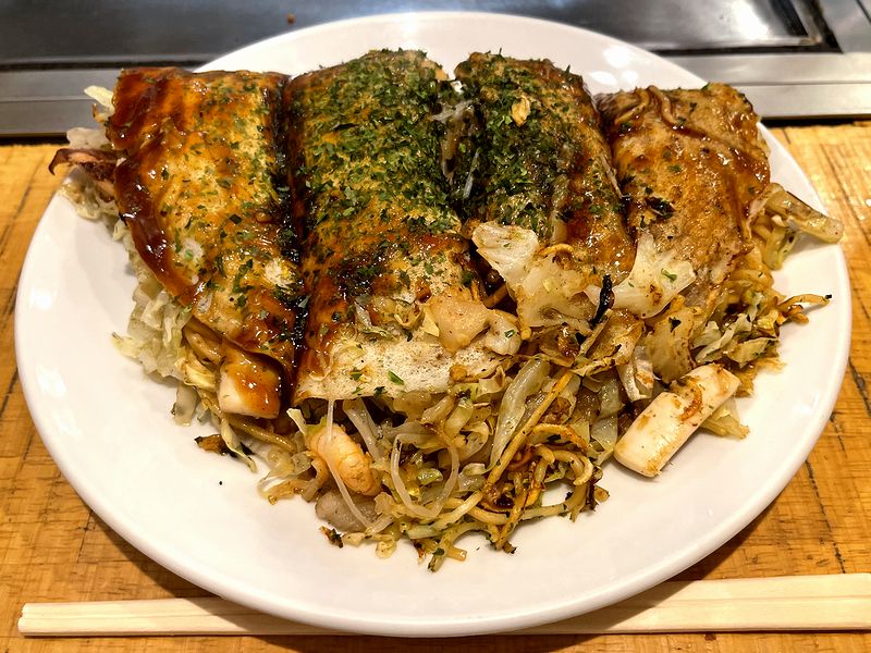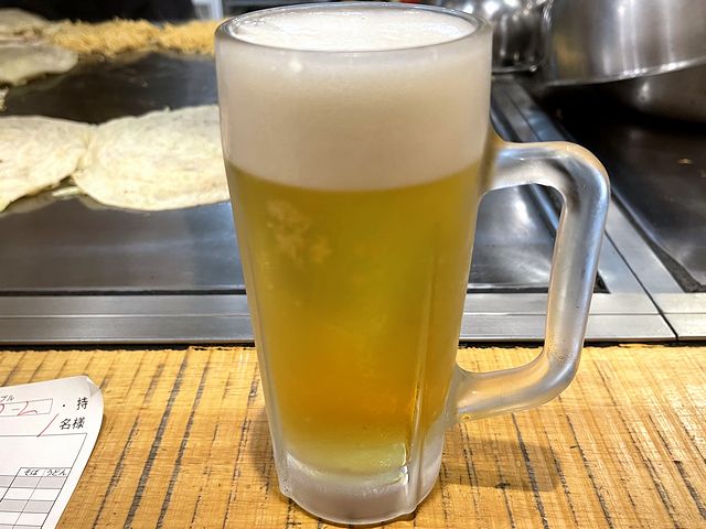 午後4時頃という中途半端な時間帯だったので、すんなりお店に入れると思っていたところ、この日はよく当てが外れるというか、広島駅からほど近いマツダスタジアムで行われる広島-阪神戦の試合前にいただくのに丁度良いからか、両チームのユニホームを着た人などで、数名よりちょっと多いくらいの入店待ち。まぁ、時間はあるからとそのまま並んだところ、タイミング的になかなかお客さんが掃けず、待つこと約15分で着席。お好み焼きは、待っている間に注文していたので、とりあえず追加で生ビールをお願いして更に待つこと暫し。眼の前の鉄板では、職人さんがいくつのもお好み焼きを最初から最後まで一人で焼き上げているので、それを見ていれば退屈はしないのですが、次に乗る電車の時刻が気になってきた頃、入店から約30分で、お好み焼きとご対面となりました。
