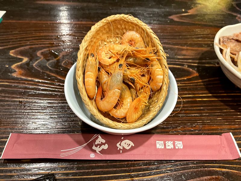 それとガラエビは、「本日のおすすめ」黒板に書かれていた品。日本全国各地、ガラエビと呼ばれるエビはいくつかいるのですが、ここ岡山ではサルエビをそう称するそうで、当地の名物料理である祭り寿司にも欠かせない食材であるとか。これは塩ゆでしたものでしょうか?殻は薄くて気にならなそうだったので、角に気をけて丸ごとポリポリいってみたところ、これが。素朴だけど滋味のある味わいで、身にはしっかりとした旨味も。当地ではかき揚げなどでも食べられているそうですが、それも美味しそうですね。