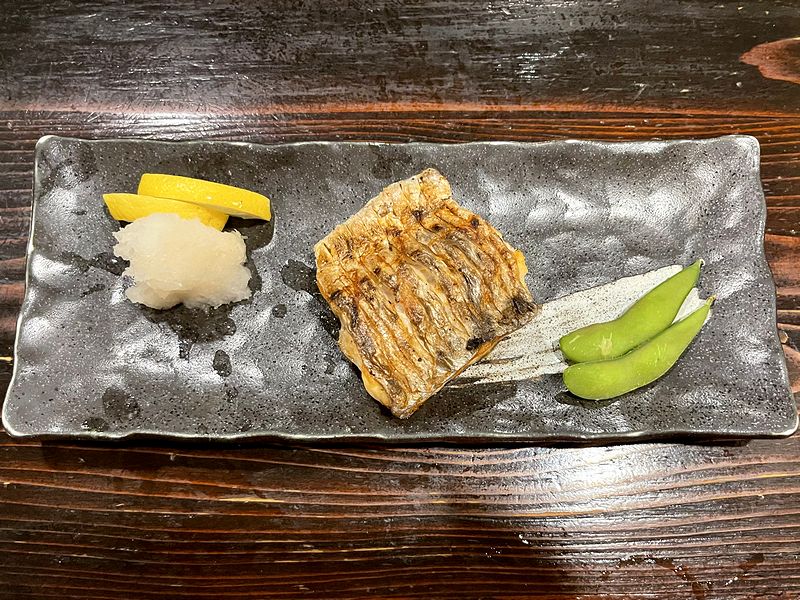 次に、太刀魚塩焼きは、これも「本日のおすすめ」黒板に書かれていた品。焼き物なので最初に頼んでおき、いい具合に酒が進んだ頃登場。で、早速いってみると、身はフワフワで脂が乗り、皮目はパリっと香ばしく。太刀魚自体、個人的にはたまに焼いて食べるくらいですが、家で焼いたものとは当然ながら違う、一段上の味わいでごさいます。