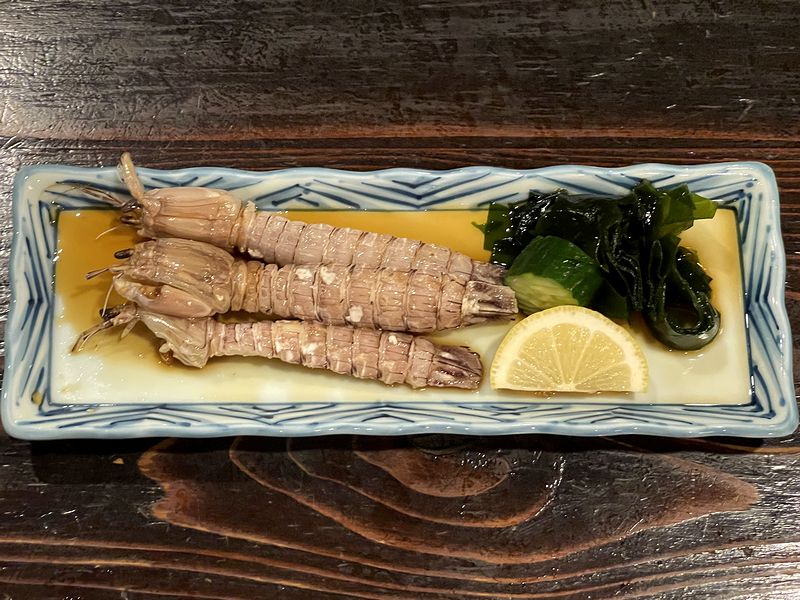 そして最後は、ものすごい品数のレギュラーメニューの中から、個人的に一番食べたいと思ったシャコ酢を。生まれてから殆どを海無し県の栃木在住なので、シャコなどは食べる機会が滅多にないのですが、子供の頃は(回るお寿司ができる前の話)好きな寿司ネタで、その後も機会があれば食べていたんですよね。で、こちらのは、三杯酢の味加減が良いというか、先程のとり酢とは違うキリッとした味わいで、シャコの味を引き立てています。それと、添えられたキュウリが蛇腹胡瓜だったのも良かったというか、こんなところで、こちらがしっかりしたお店であることを感じました。