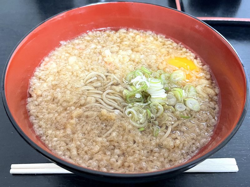 次にツユをひと啜りすれば、天かす由来のコクとコッテリ感がこれまた良い感じ。ベースのツユは、出汁感控えめの、いかにも万人向けという味わいのものですが、その味がグレードアップ。そこに生卵が加われば、もう、無敵ですね。