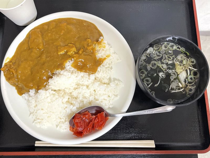 で、ルーの色が黄色っぽく、パっと見でトロミが強いため、それだけで懐かしい感じがしますが、実際にいただいてみても期待は裏切られないというか、もったりとした口当たりのルーは辛さ抑えめですが、ちゃんと「ライスカレー食ってるぞ」感がありますね。また、肉が豚肉というのも、このあたりの懐かしいカレーみがあり、ルーの量もたっぷりでライスが足らなくなる程というのが嬉しいです。
