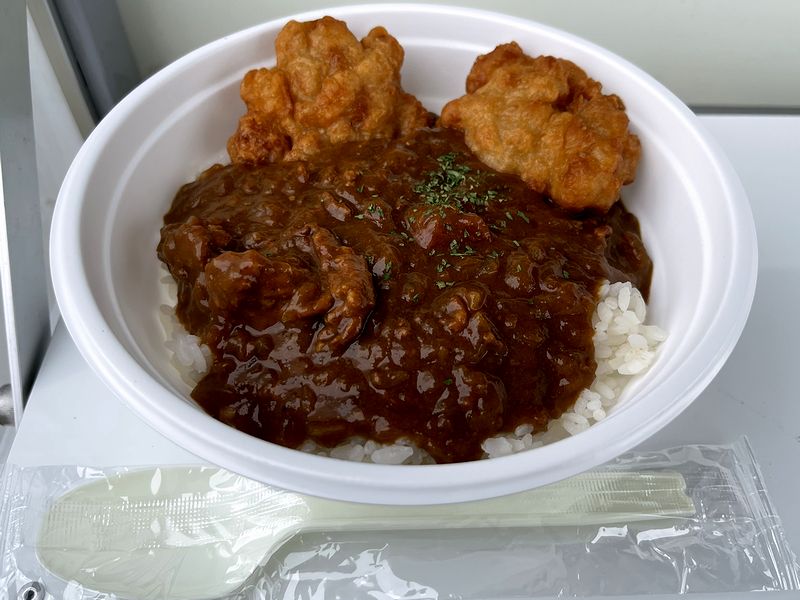 車体に貼られていたメニューには、無水カレー(700円)、カツカレー(900円)もあったのですが、今回は値段的に真ん中の唐揚げカレーを。ちなみにどれも「中辛」と書かれている=辛さは1種類のようです。