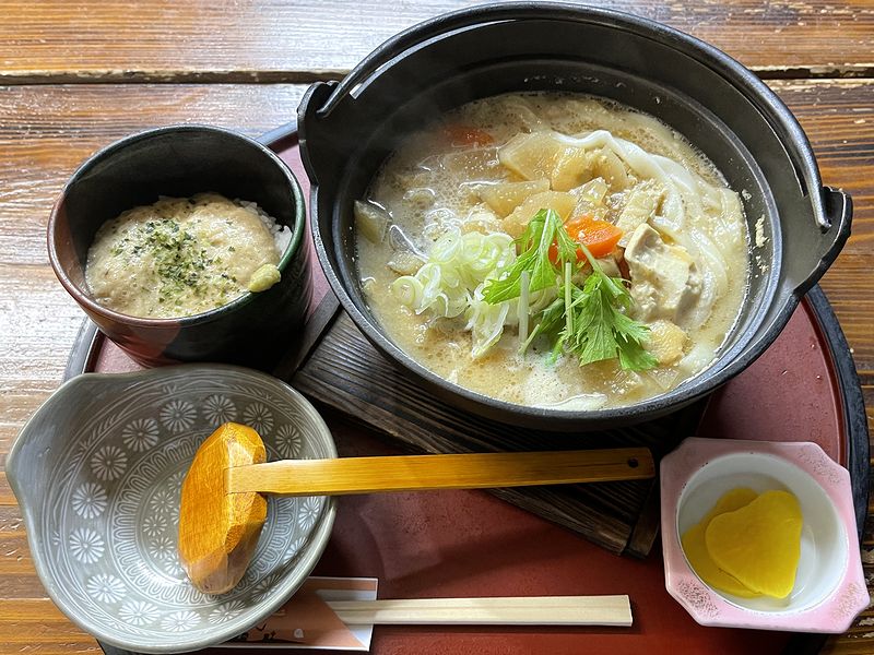 それで今回私は、ランチセットの定番で、個人的にも何度かいただいたことがあるけんちんうどんとミニとろろ飯のセットを、うどん大盛りで。注文後、あまり待たずに登場したら、熱々の鉄鍋から呑水に適宜とり、よくふうふうしてからいただけば、これが、もう!