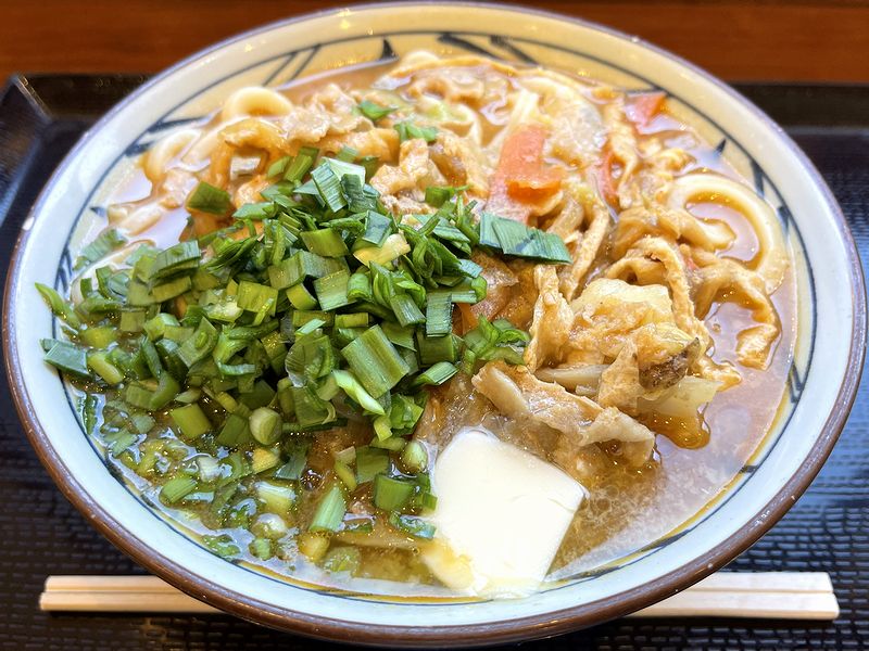 そしてニラとバター以外の具は、前回いただいたノーマルと変わらず、豚肉、キャベツ、タマネギ、ニンジン、ゴボウ、そし油揚げといったところですが、ニラやバターが加わっても相性は良いまま。あと、丸亀製麺さんには薬味として自由に取れる青ネギとおろしショウガがあるけど、生ニラのおかげでその2つはいらないかもしれません。