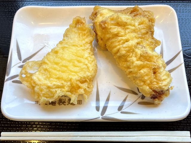 こちらは、一緒にいただいた品。かしわ天はタンパク質補給でいつもいただいていますが、赤魚天は初めてお目にかかります。で、その赤魚天ですが、わりと魚自体の風味が強く、身は水分もありつつフワっとした食感。出汁醤油でも出汁ソースでも問題なくいただけました。