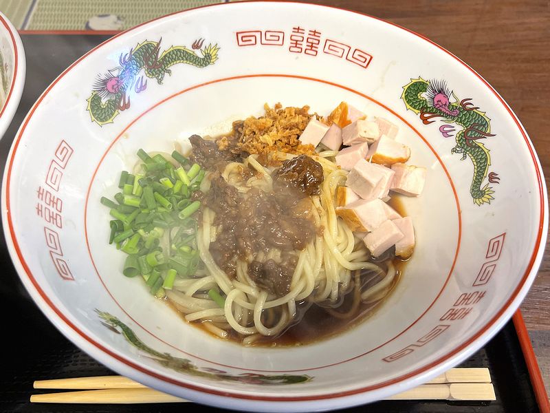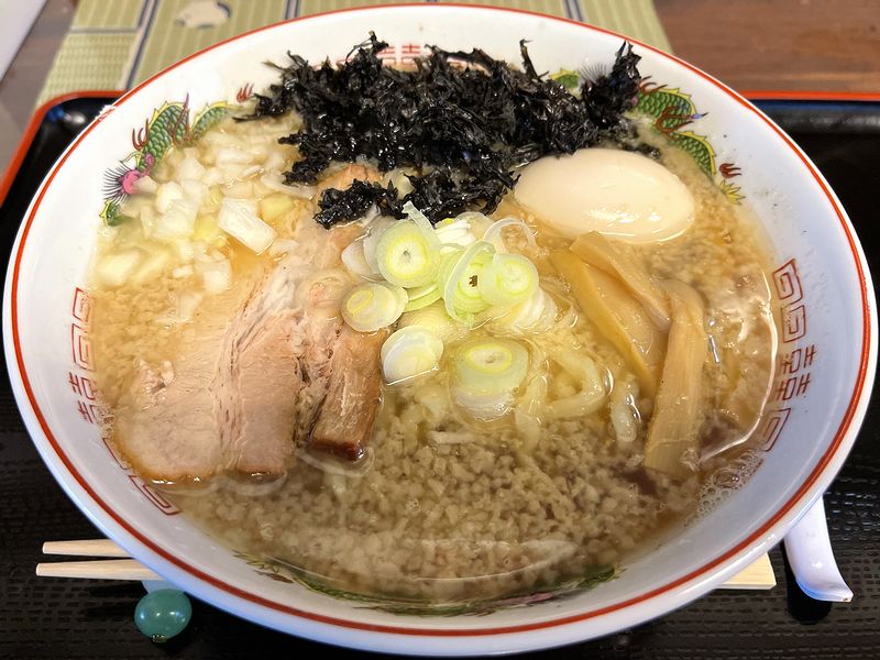 もうもうと湯気が立つ状態で登場しましたが、それで麺は、こちらのお店の塩ラーメンや醤油ラーメンに使われている中細のストレート麺と同じでしょうか?ちなみに店主さんによると、麺量は100gとのこと。で、その上に、醤油色の牛脂ダレ?がかかり、サイコロ状のモモチューシューがたっぷりと。そしてネギは青ネギ、更にはフライドオニオンという構成でした。