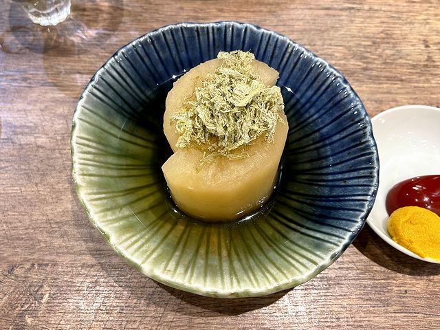 まずド定番の大根は、当然ながら芯までしっかりと味が染み、更に食感も柔らかいものの大根の良い意味での繊維感もあって、言うこと無い、申し分ないお味。おぼろ昆布も良いアクセントになっています。