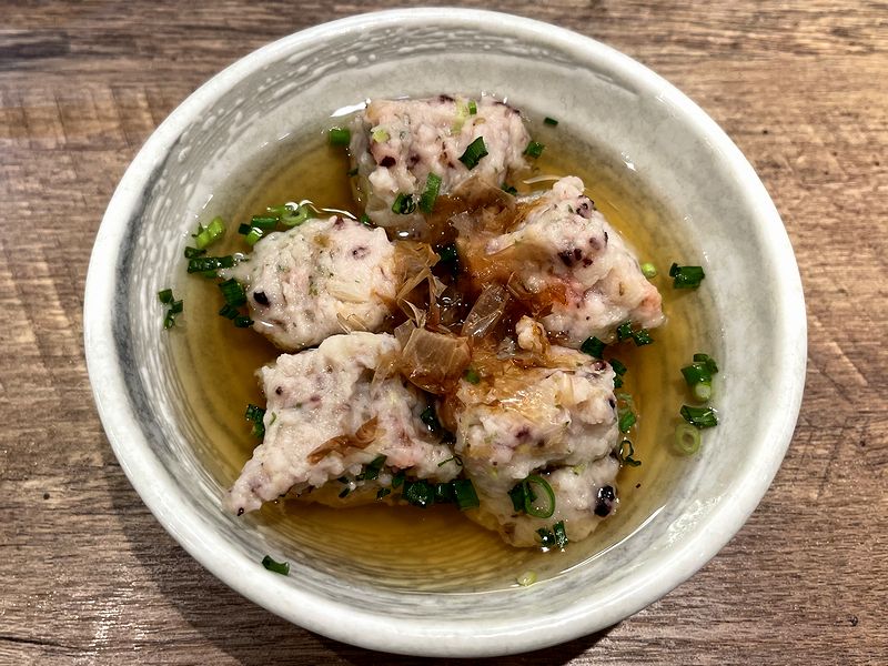 そして、青竹蛸つみれは、お店のウェブサイトだと「イチ押しメニュー」となっている品で、注文を受けてから出汁に入れ仕上げるそう。(確かに、注文からすぐには出てきませんでした。)それでこれは、フワホロっと柔らかい食感と、名前だけじゃない爽やかな青竹の風味が印象的ですね。またもともと旨味が強い蛸という食材がメインだからか、タネ自体の味もしっかりしていて、そこにあご出汁もたっぷり含んでいるものだから、これが、もう。鰹節で香りと旨味が更に追加され、散らした小ネギの風味も合ってますね。
