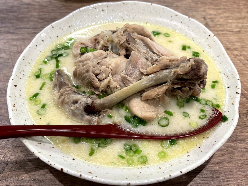 こちらは、2種類ある出汁のもう1つ、鶏だしを使用した品で、蛸つみれ同様お店のウェブサイトだと「イチ押しメニュー」となっている品。注文の際、「少々お時間がかかります」とのことで、少々経ってからの登場となったのですが、鶏の水炊きを思わせる白濁した出汁の中には、良く煮込まれて骨が外れかかった鶏もも肉が。