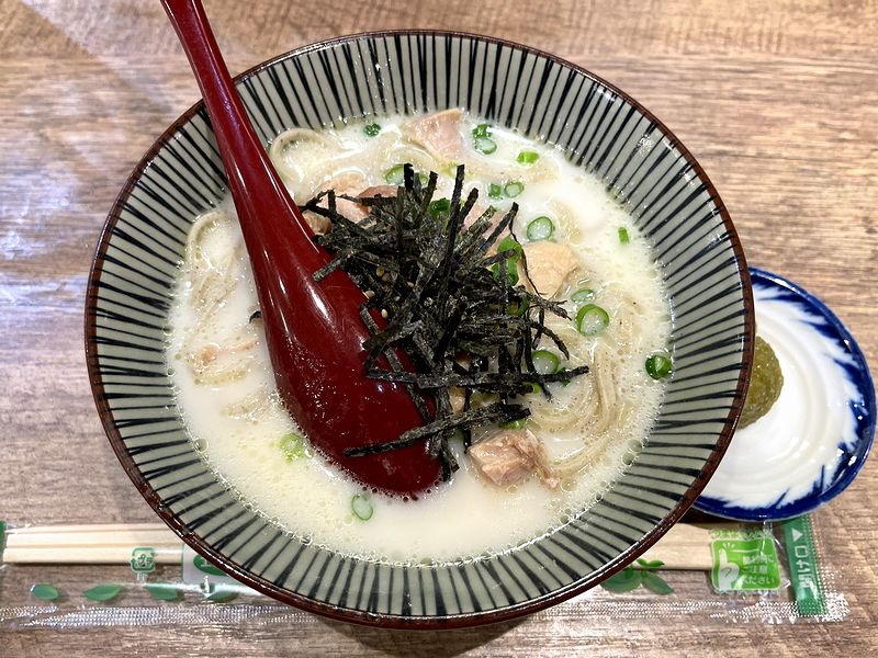 そこに、刻み海苔とゴマ、小ネギが味と香りのアクセントを加え、具として先述の骨付鶏のようなホロホロの鶏肉も入っていました。