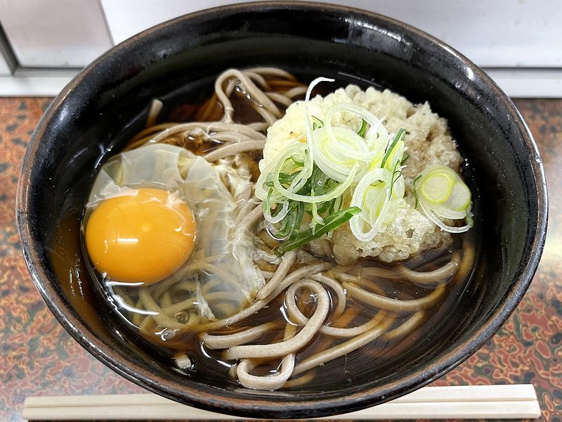 そしてかき揚げは、中央の乾燥した小エビ1尾以外は全部衣という、北海道(に限らず)の一部駅そばではトラディショナルなスタイル。ツユとの馴染みは良いというか、いただいているとホロリと解けていきます。またツユの熱で白身が微かに固まった生玉子も、つゆの味が濃いので最高の相性。更に薬味のネギも、しっかりと存在を主張します。