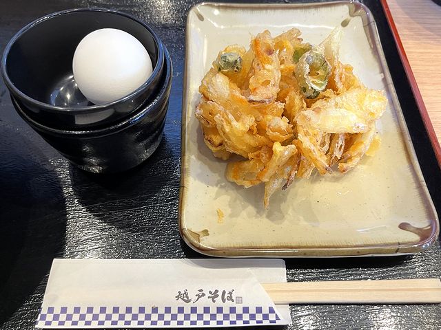 それで今回は、かけそばに温泉たまごと野菜かき揚げを追加して。っていうか、以前いただいた温玉そばの存在をすっかり忘れ、10円割高な買い方をしてしまいました(温玉そばだと並で630円)が、温玉が別の器で貰えるため、サイドメニューにも展開しやすいな、と。