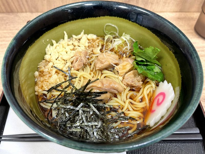 食券提出から、ほんの少しだけ待って登場した冷たい鳥中華。見た目的には、具の鶏肉のほか、天かすや刻み海苔といった、当地の鳥中華でもよく見られるものが載っていて、さらには三つ葉まであしらわれているというのが、何ともいい感じ。