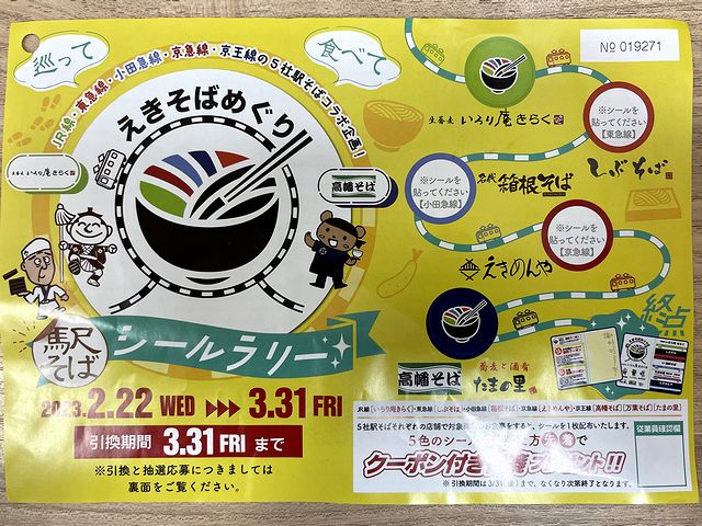 『駅そばシールラリー』の2店目は、JRの宇都宮駅から一気に東京都へと移動し、京王電鉄の高幡不動駅まで。京王電鉄では、傘下の(株)レストラン京王が、「蕎麦居酒屋」を謳う『たまの里』、店内製麺の『万葉そば』、純然たる駅そばの『高幡そば』という3つのブランドでそば店を展開しており、どれも駅そばシールラリーの対象となっていますが、今回は主に営業時間の関係から、『高幡そば』の高幡不動店でいただくことにしました。
